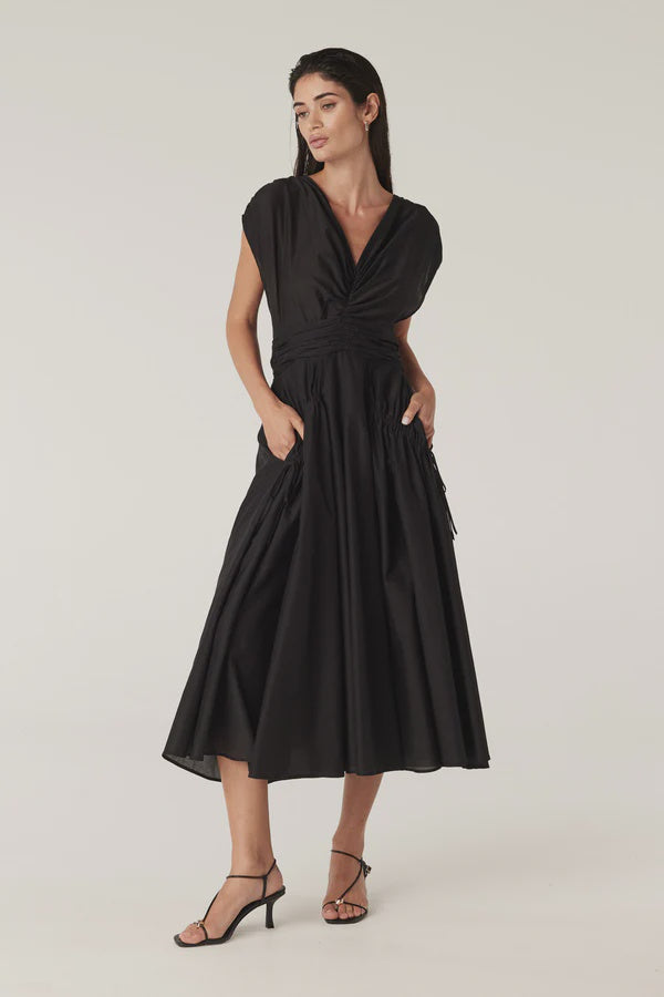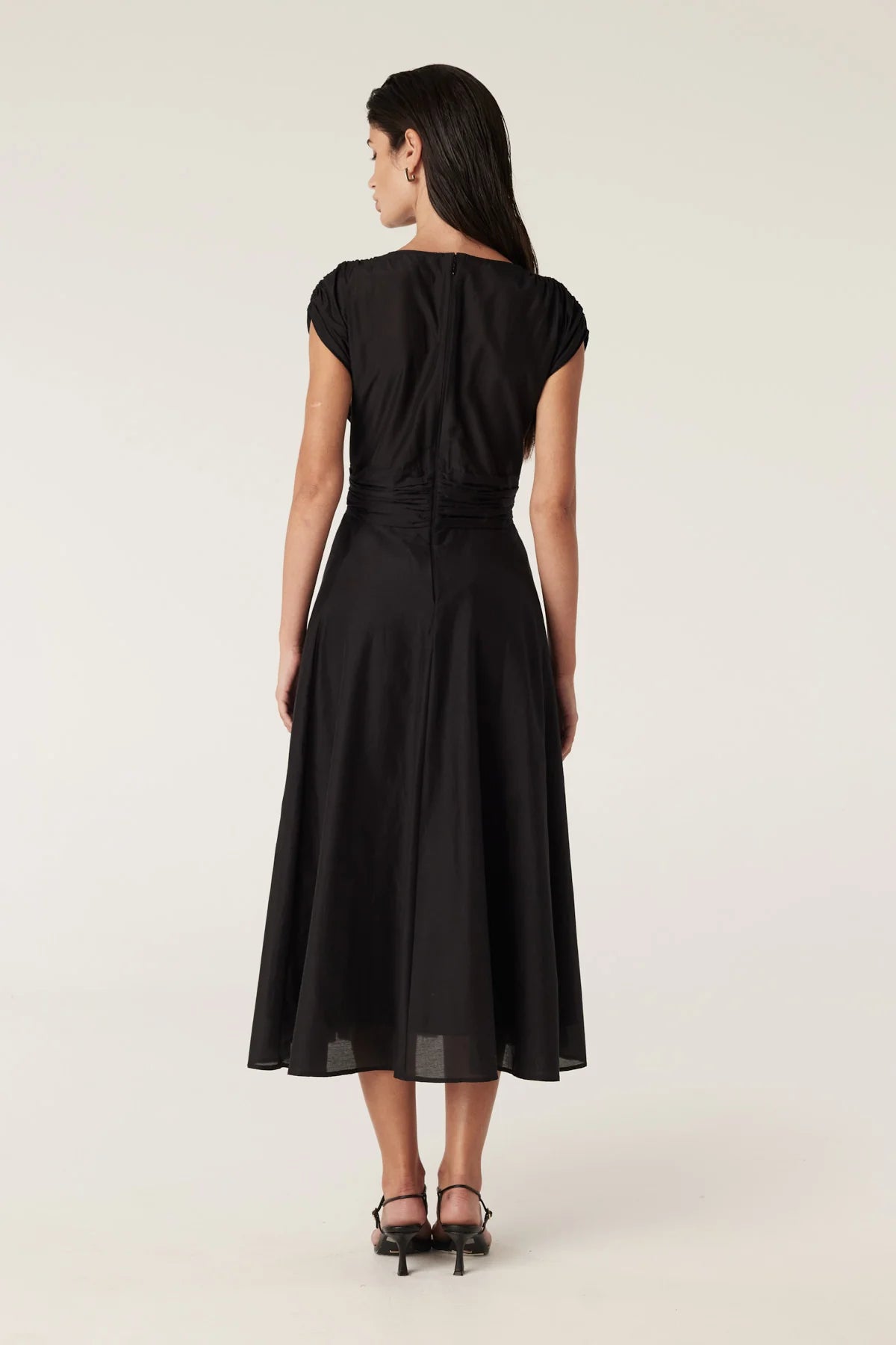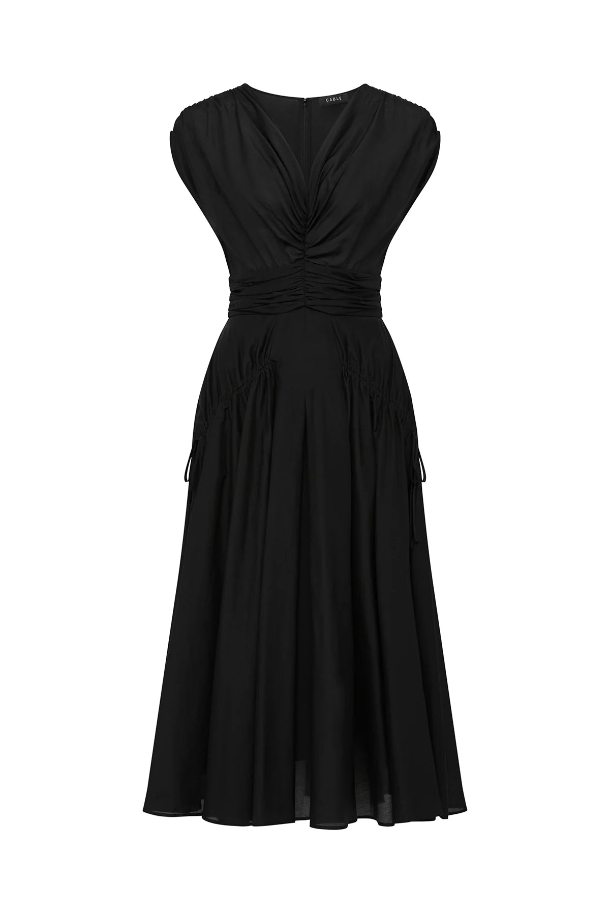 The Layla Midi Dress from Cable features a fit-and-flare silhouette with soft gathers at the front V-neck and waist. It has rouching details with ties on the low hip and an invisible back zip. Made from sheer silk / cotton voile with a cotton lining.