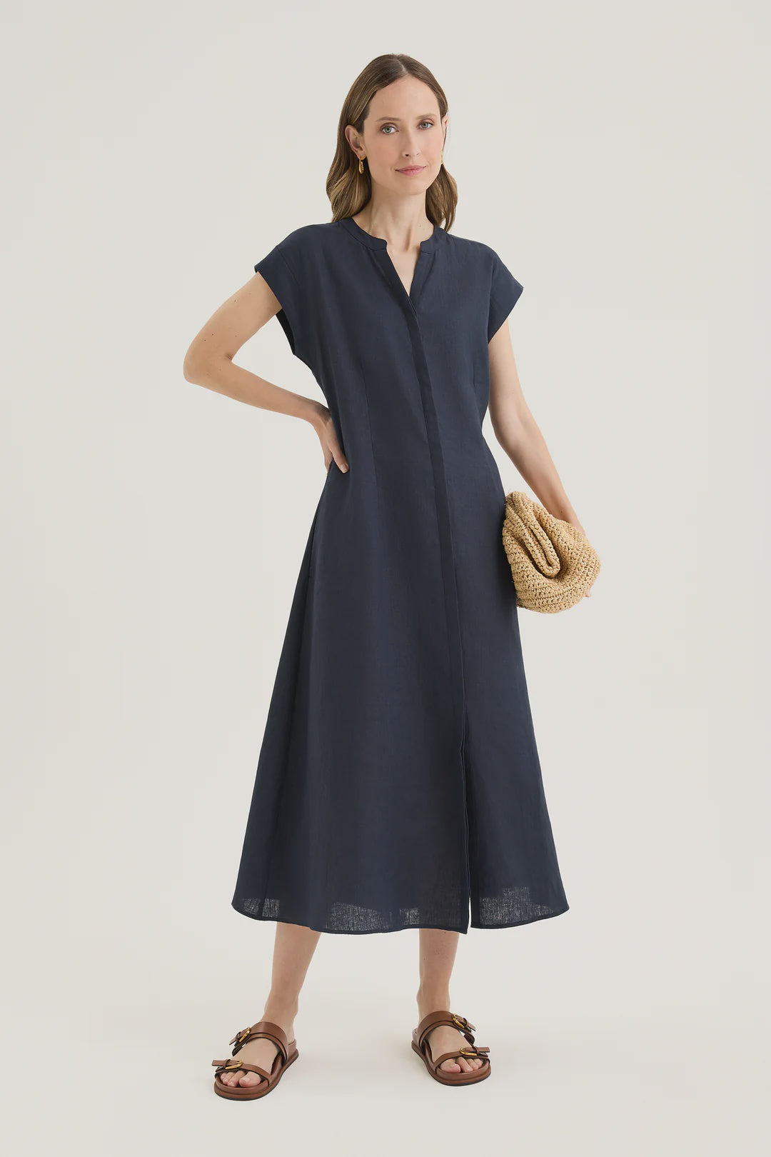 The Bohdi Dress blends soft, bohemian-inspired flow with classic Yarra Trail detail. Crafted from a lustrous ramie-tencel blend, it drapes beautifully and moves with ease, offering a lightweight linen-like texture. The cut-away round neckline can be styled two ways - worn open for a relaxed V-neck effect, or drawn in with the encased drawstring for a softly gathered, rounded shape.