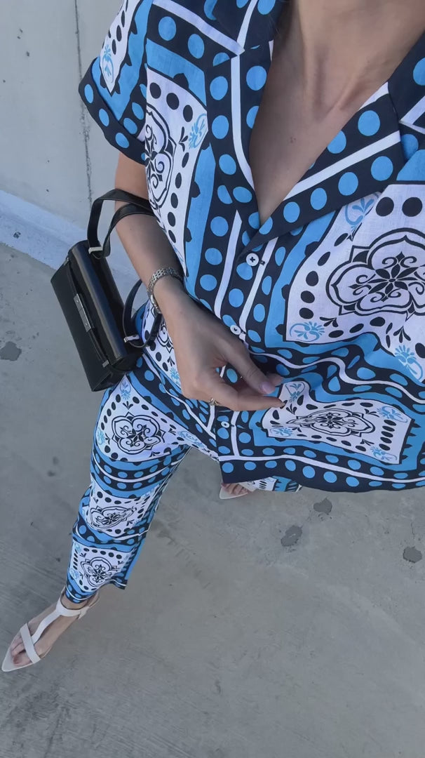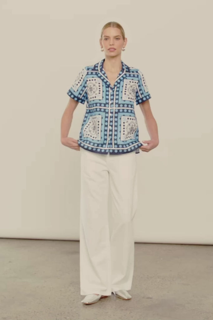 The Zoe Kratzmann Lumen Top is an easy-fitting style, defined by a traditional collar, subtle side splits, and porcelain shell buttons for contrast. Designed for elevated everyday wear, it’s a piece that travels well and transitions with ease. finished in the distinguished scarf print, inspired by worldwide journeys.