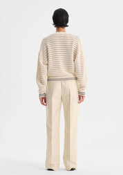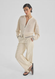 The Dallas Jacket from Morrison is crafted from a soft cotton-blend yarn with an airy open mesh stitch throughout. Designed with a relaxed silhouette, full-length sleeves, and a sleek double-ended front zip, it’s finished with bold contrast stripe detailing at the cuffs and hem for a refined look.