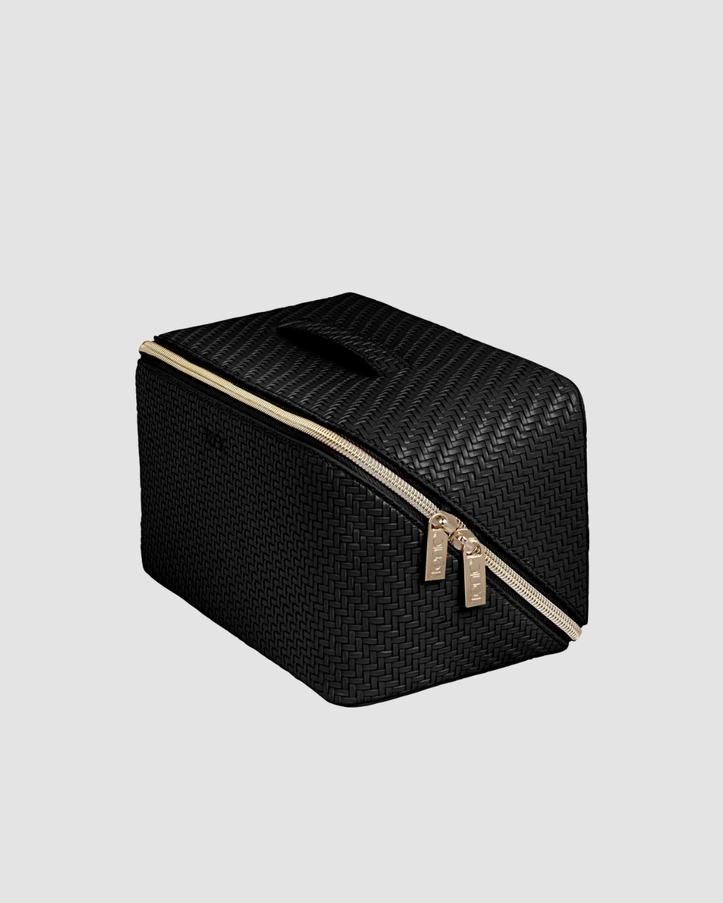 The Tonic Herringbone Beauty Bag Large features a luxe double gold zip closure opening wide and flat to reveal a spacious interior, allowing for easy visibility of everything inside. The internal zipped pocket is perfect for storing small beauty accessories, while the main compartment fits your skincare and makeup essentials perfectly.