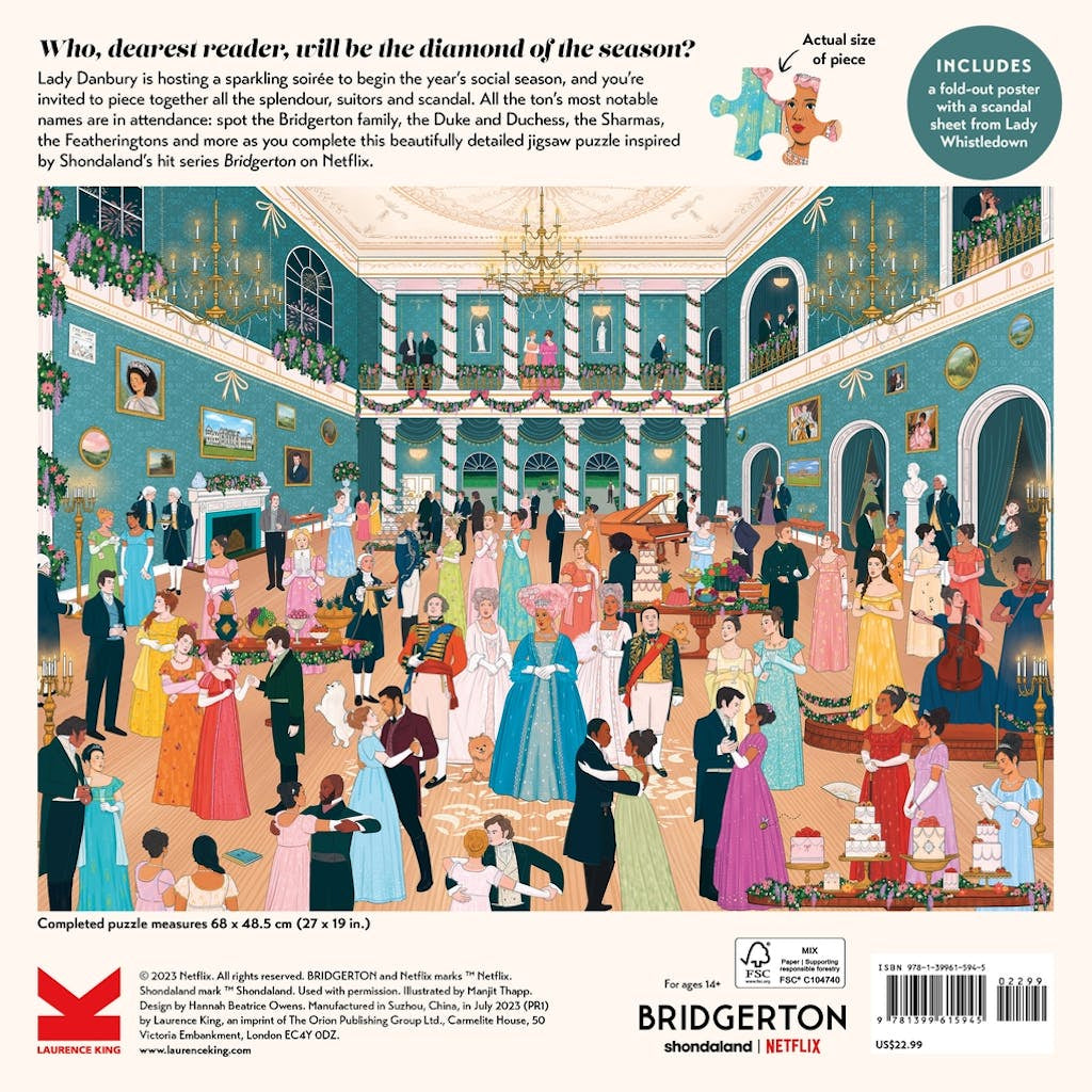 Lady Danbury is hosting a sparkling soirée to begin the year's social season, and you're invited to piece together all the splendour, suitors and scandal. All the ton's most notable names are in attendance: spot the Bridgerton family, the Duke and Duchess, the Sharmas, the Featheringtons and more as you complete this beautifully detailed jigsaw puzzle inspired by Shondaland's hit series Bridgerton on Netflix.