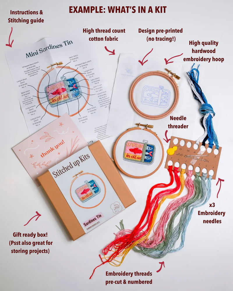 Our Mini Sardines Tin design features a colourful vintage tin illustration, perfect for adding playful personality to your stitch collection. With a pre-printed fabric (no tracing needed), premium wooden hoop with gold hardware, and easy-to-follow instructions, it’s ideal for beginners looking for a relaxing, creative outlet.