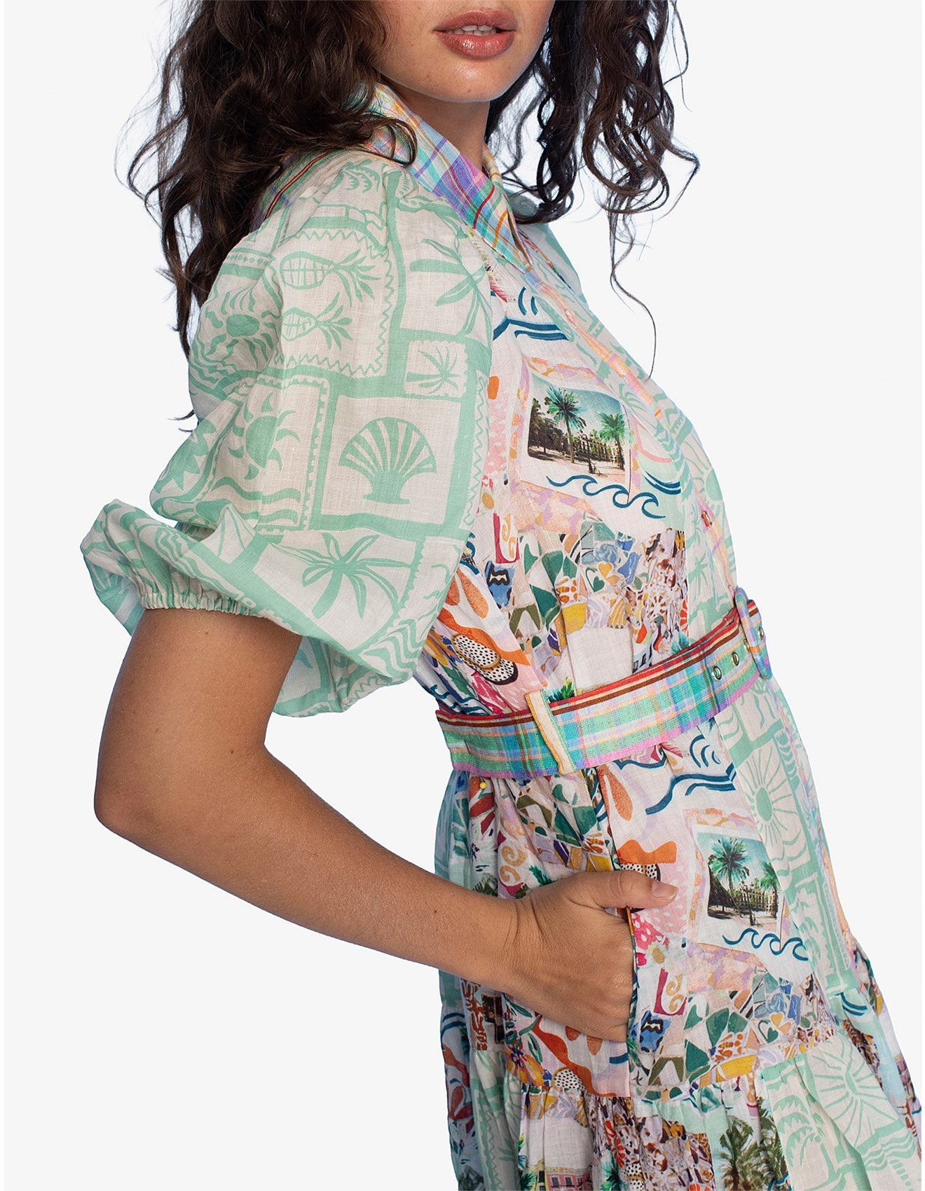 The Jean Maxi Dress is a lively and stylish choice, featuring a high collar, short puff sleeves, and a button-up front. An adjustable belt shapes the waist, forming a flattering A-line silhouette that’s perfect for capturing those picture-perfect moments.
