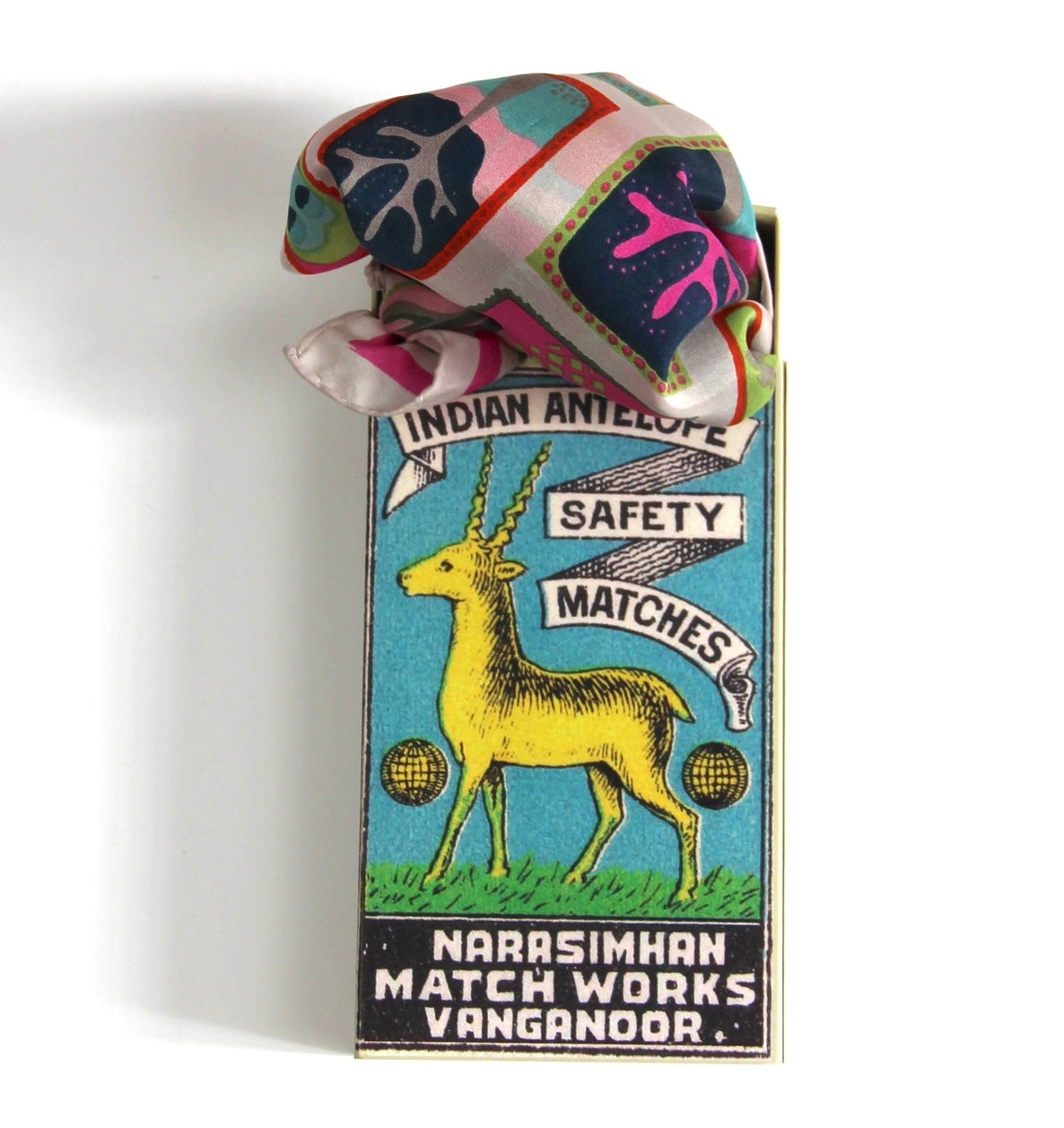 Mini Scarves make an original gift, they can be worn around the neck, around the wrist, as a headband, in a bun or even around the bag... They are drawn by hand in France and printed by hand in India. They have an exceptional finish with a hand-rolled hem. They are sold in a box inspired by vintage matchboxes.