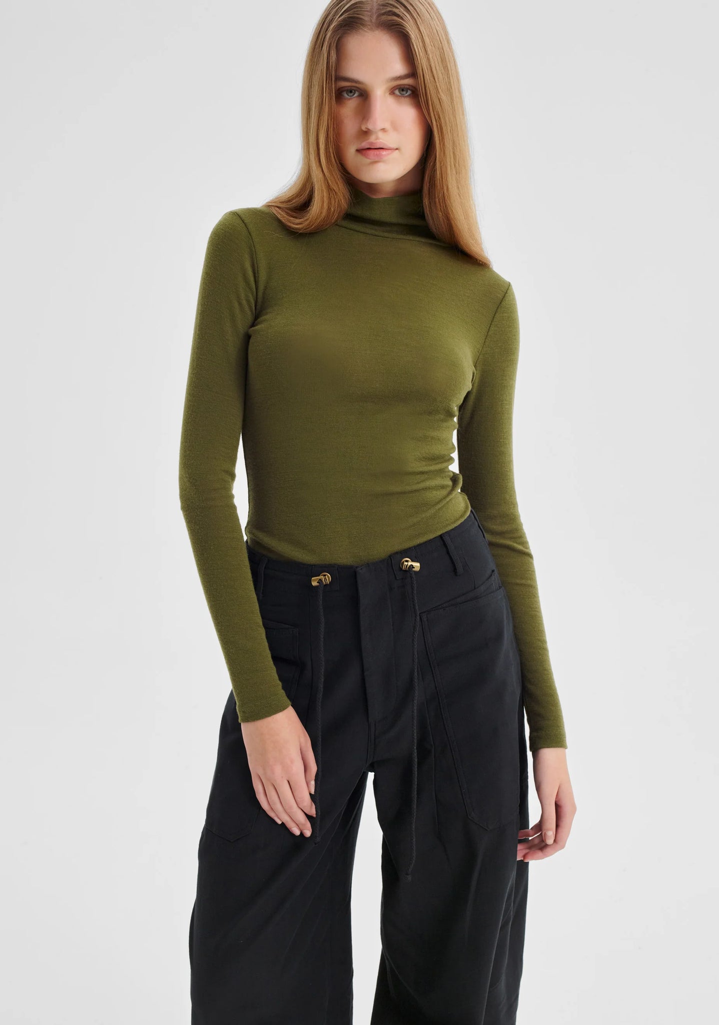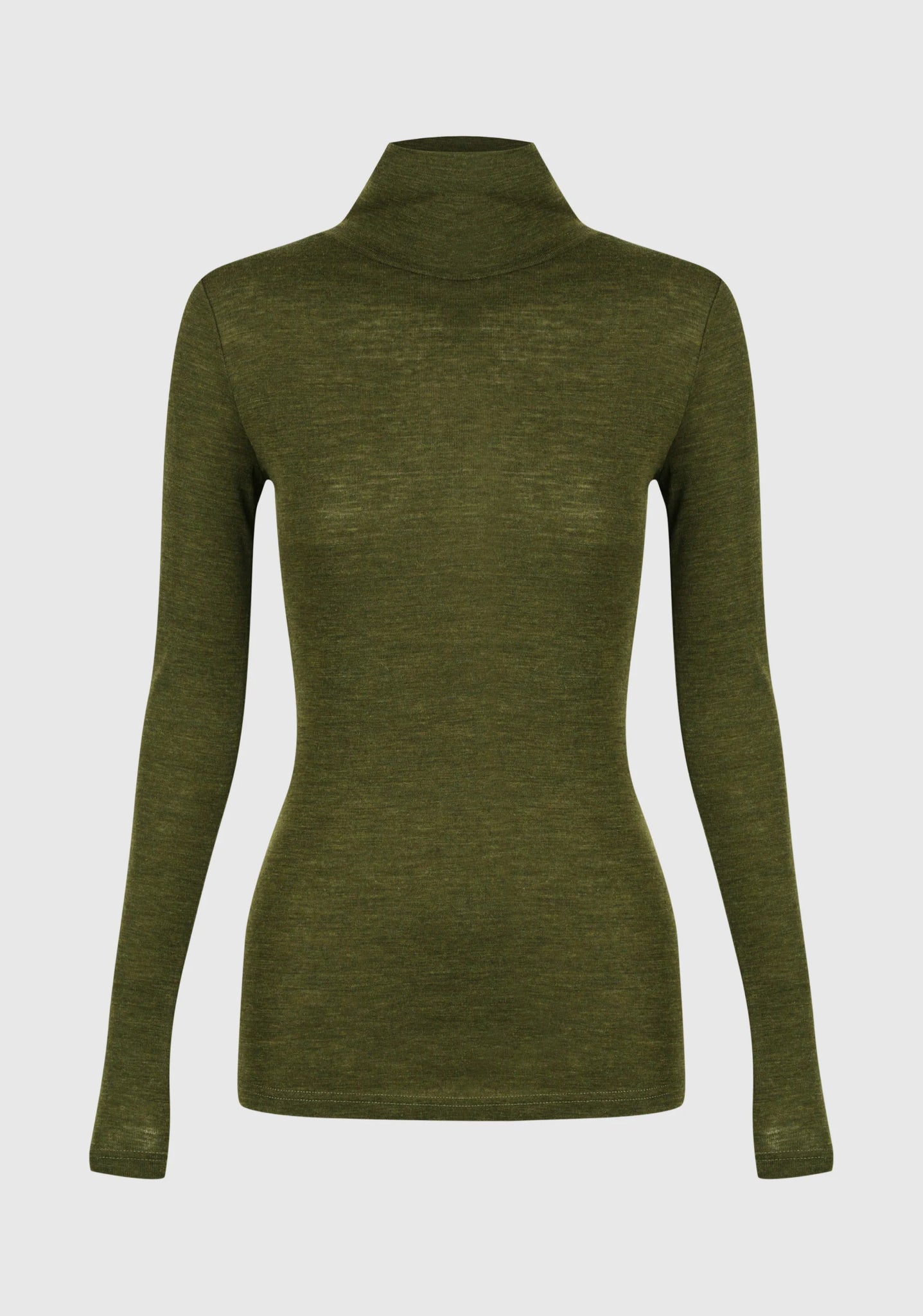 A sleek, fitted top made from 100% superfine Australian Merino wool, featuring a high neck and full-length sleeves for a soft, breathable layer that feels luxurious against the skin.
