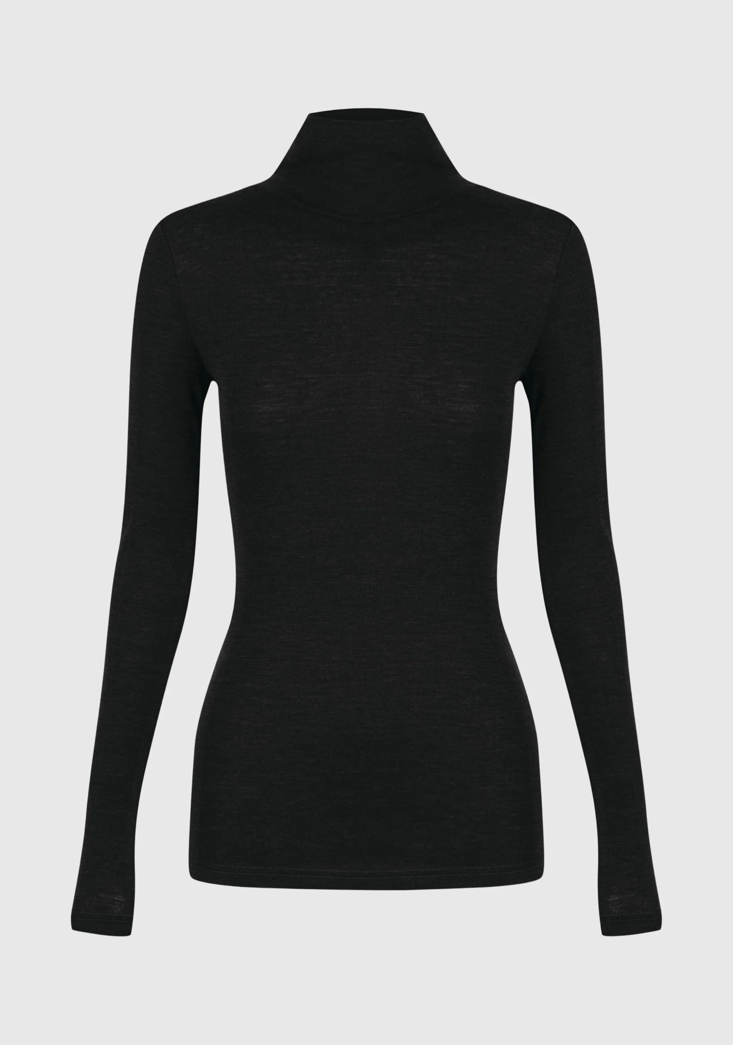 A sleek, fitted top made from 100% superfine Australian Merino wool, featuring a high neck and full-length sleeves for a soft, breathable layer that feels luxurious against the skin.