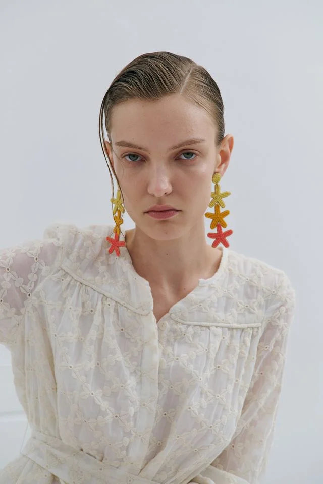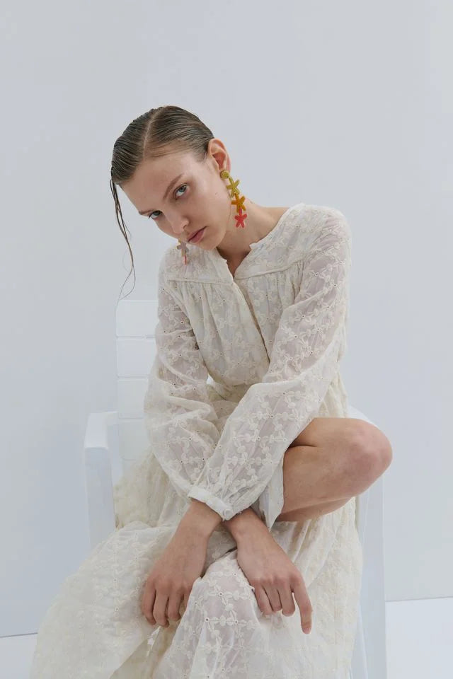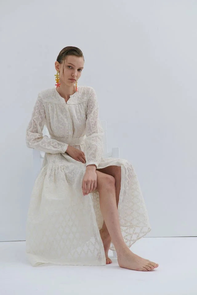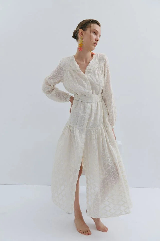 The Nina Maxi Dress from Maevarii in the ultra feminine White Queen fabric, featuring a self tie, sheer sleeves and full length closure.