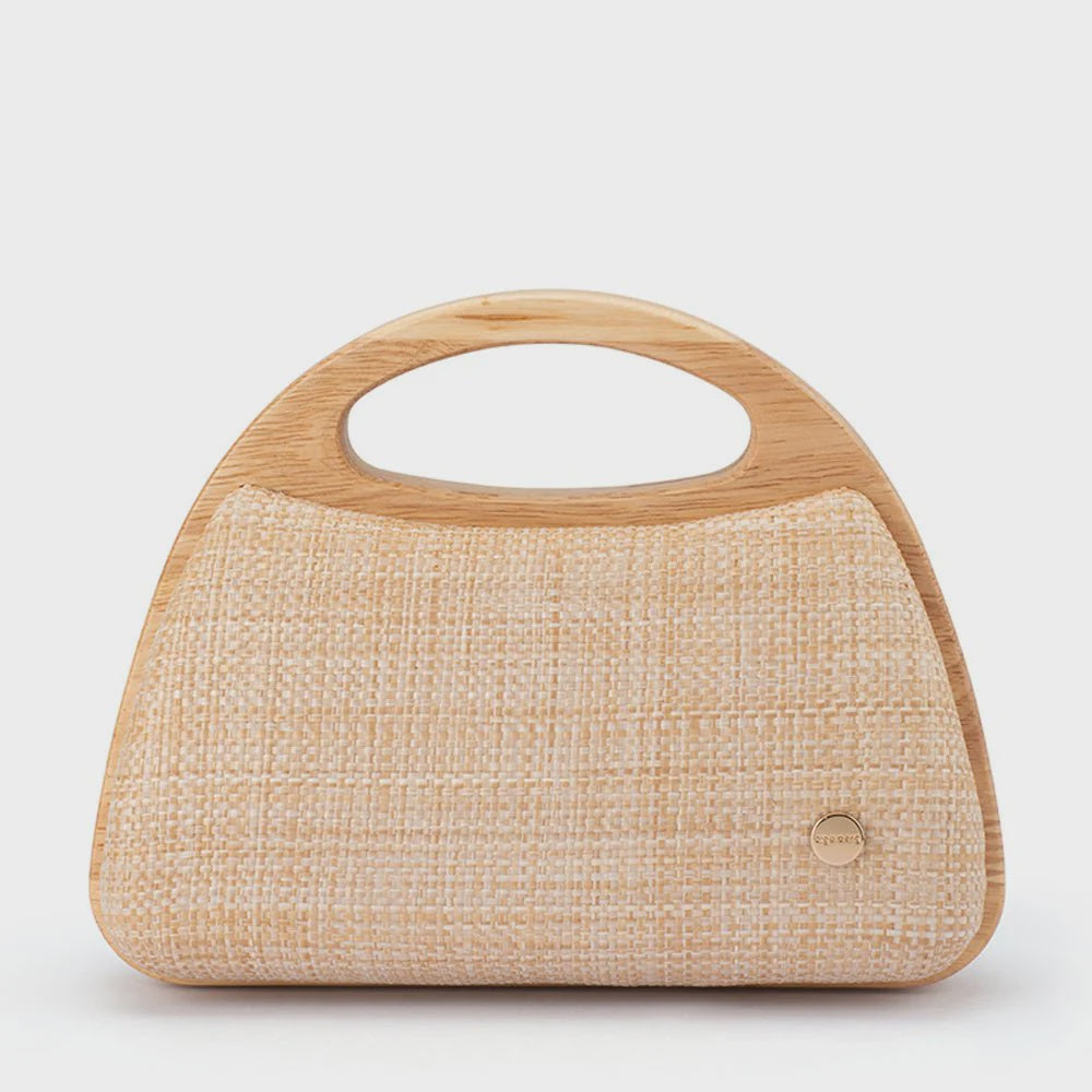 The SARAH Wooden Frame Grab Bag from Olga Berg features a stunning woven exterior complemented by a wooden frame. A great option for round the clock events. This bag includes a detachable shoulder chain for when you need to be hands free.