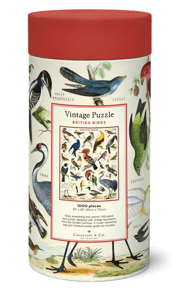 Delight in the beauty of Britain's feathered friends with the Cavallini Vintage 1000-Piece Puzzle – British Birds. Featuring exquisite bird illustrations from historic archives, this puzzle offers a relaxing and rewarding challenge. Packaged in a 25 cm puzzle tube with a drawstring muslin bag for secure storage, it also includes a helpful poster guide to assist in assembly. Once completed, the 55 x 70 cm puzzle becomes a stunning piece ready for framing or display.