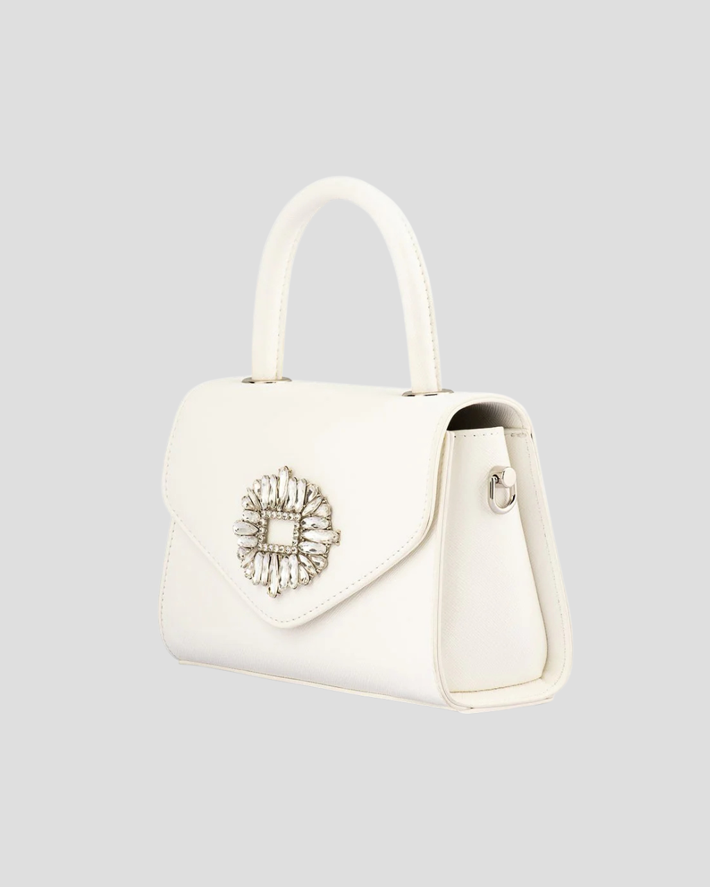 The ALEJANDRA Embellished Top Handle Bag from Olga Berg features a crystal embellishment on the front flap to add a little sparkle to your special occasion looks. Make your entrance holding the short handle or use the optional shoulder chain to dance the night away.