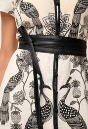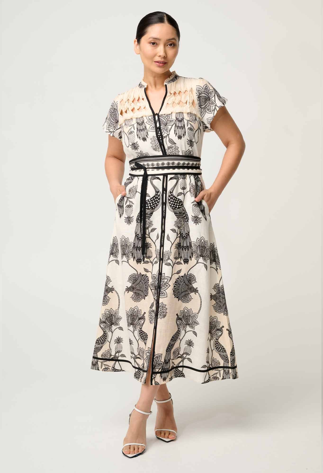 The intricately printed florals and regal birds cascade effortlessly down the A-line silhouette, drawing the eye and adding artisanal flair. Thoughtfully designed with a V-neckline, soft cap sleeves, and a contrasting waistband tie, the Xanthia dress flatters the figure while remaining comfortable and breathable.