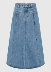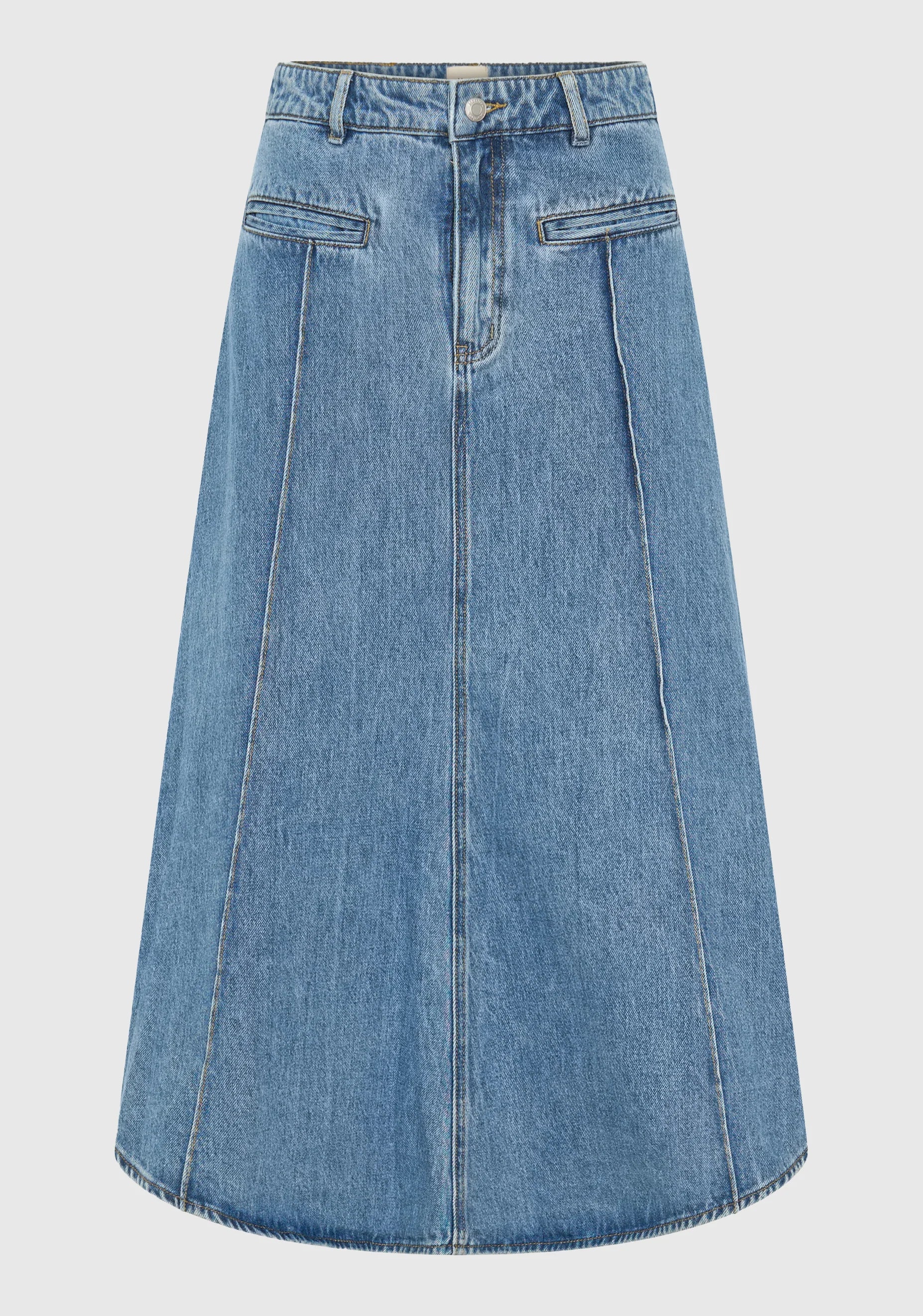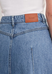 In mid-weight cotton denim, the Jacque Skirt offers effortless wear with a fly front closure and sleek jet pockets. A back yoke and pintuck details shape the A-line silhouette, while the midi length makes it a versatile wardrobe staple.