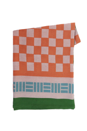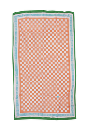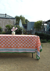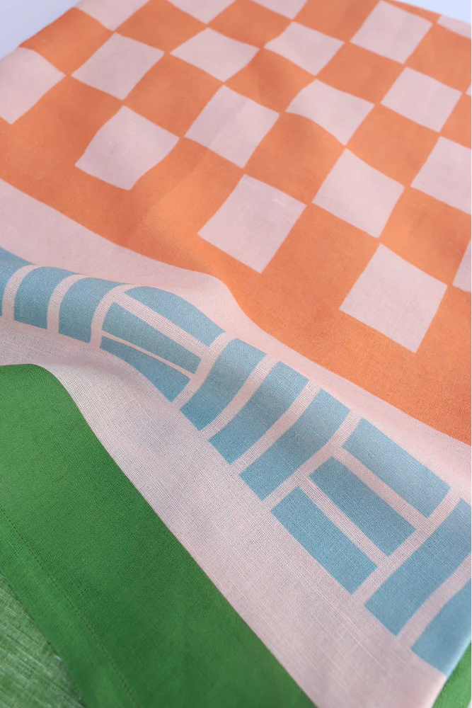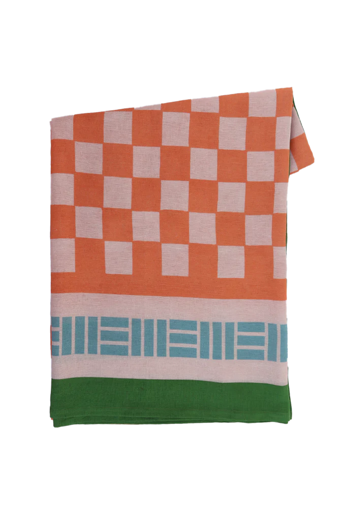 The Cactus tablecloth, a classic check print in peaches and cream surrounded by a contrast blue and green stripe border. A tablecloth complimentary for Summer alfresco dining. The core ingredient of any great table setting. Designed to be paired back with matching print or plain napkin sets and crockery staples from the home. Made to mix and match.