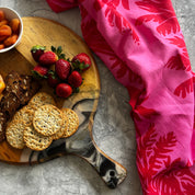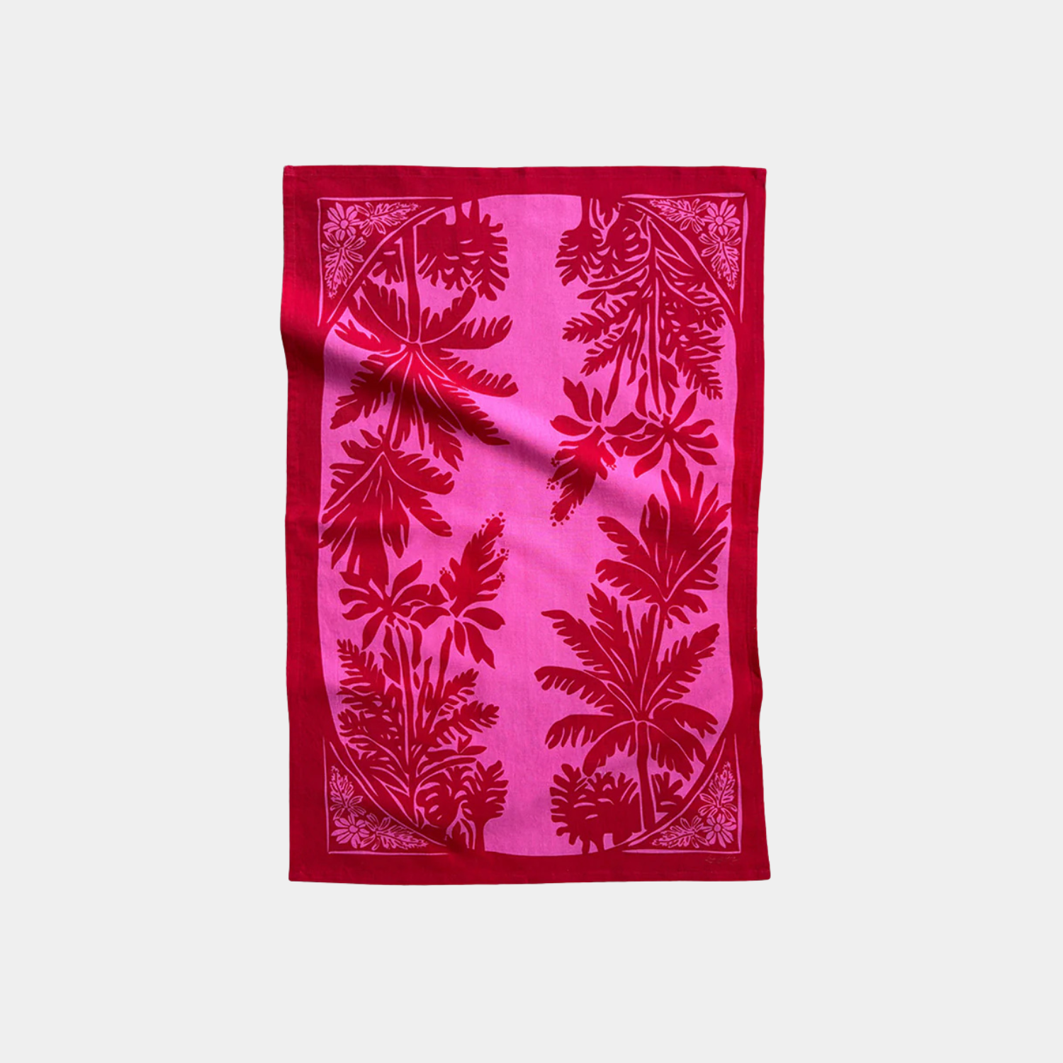 Aura, a cotton/linen blend tea towel from Loco Living, featuring duotone motif of summer palms through a window. Bordered with a simple floral design and drenched in a rich pallet of pink and red. An absorbent, quick to dry kitchen necessity.
