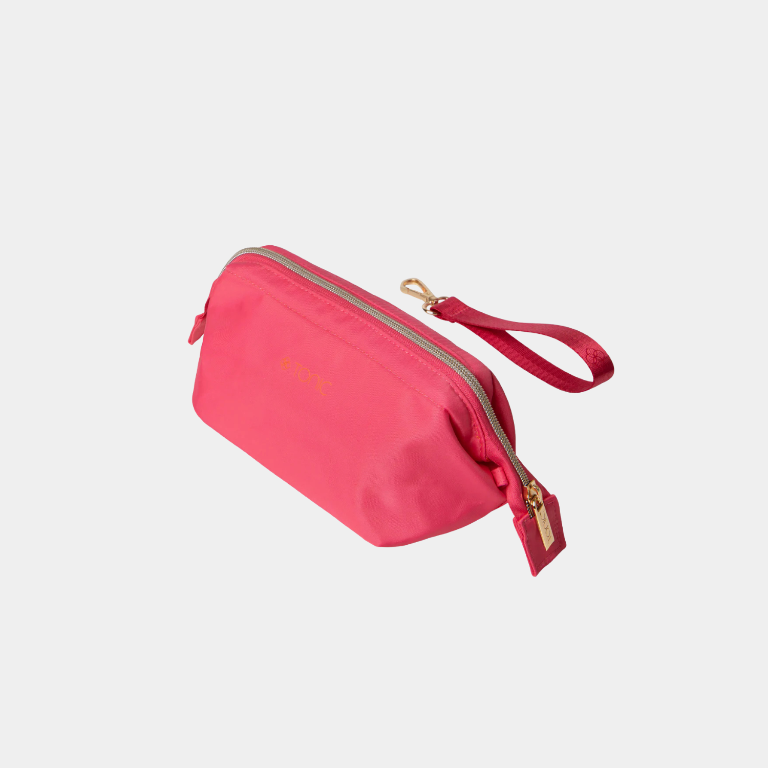 Crafted from recycled nylon with a playful contrast interior, the medium Splash makeup bag features an elegant gold zip closure and detachable webbing strap.