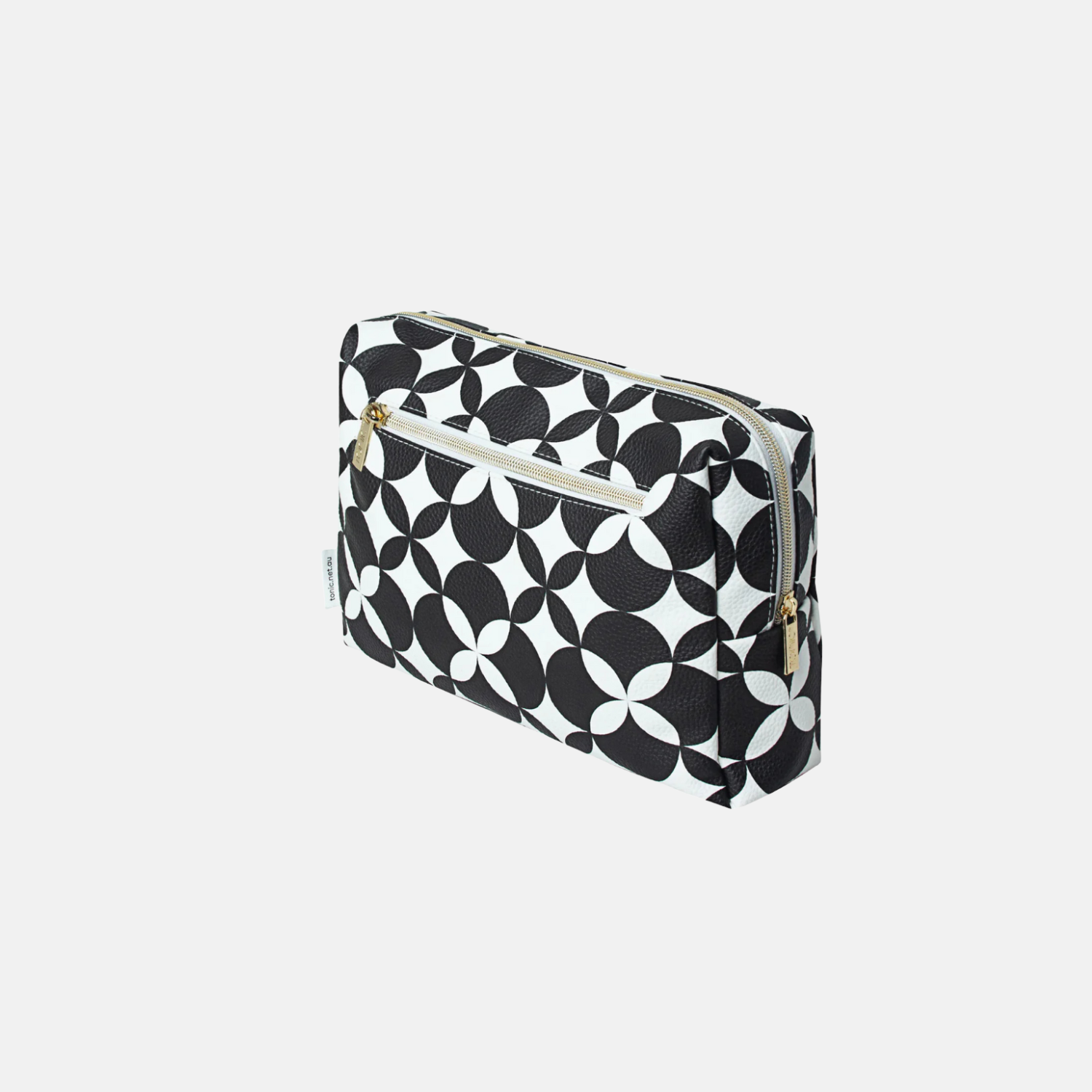 The perfect size for your complete cosmetic collection, the Iconic large makeup bag from Tonic is crafted from easy care PU in a bold geometric design. Based on the Tonic logo, the Iconic print features linked circles alternating in contrasting black and white accented with classic gold zips.