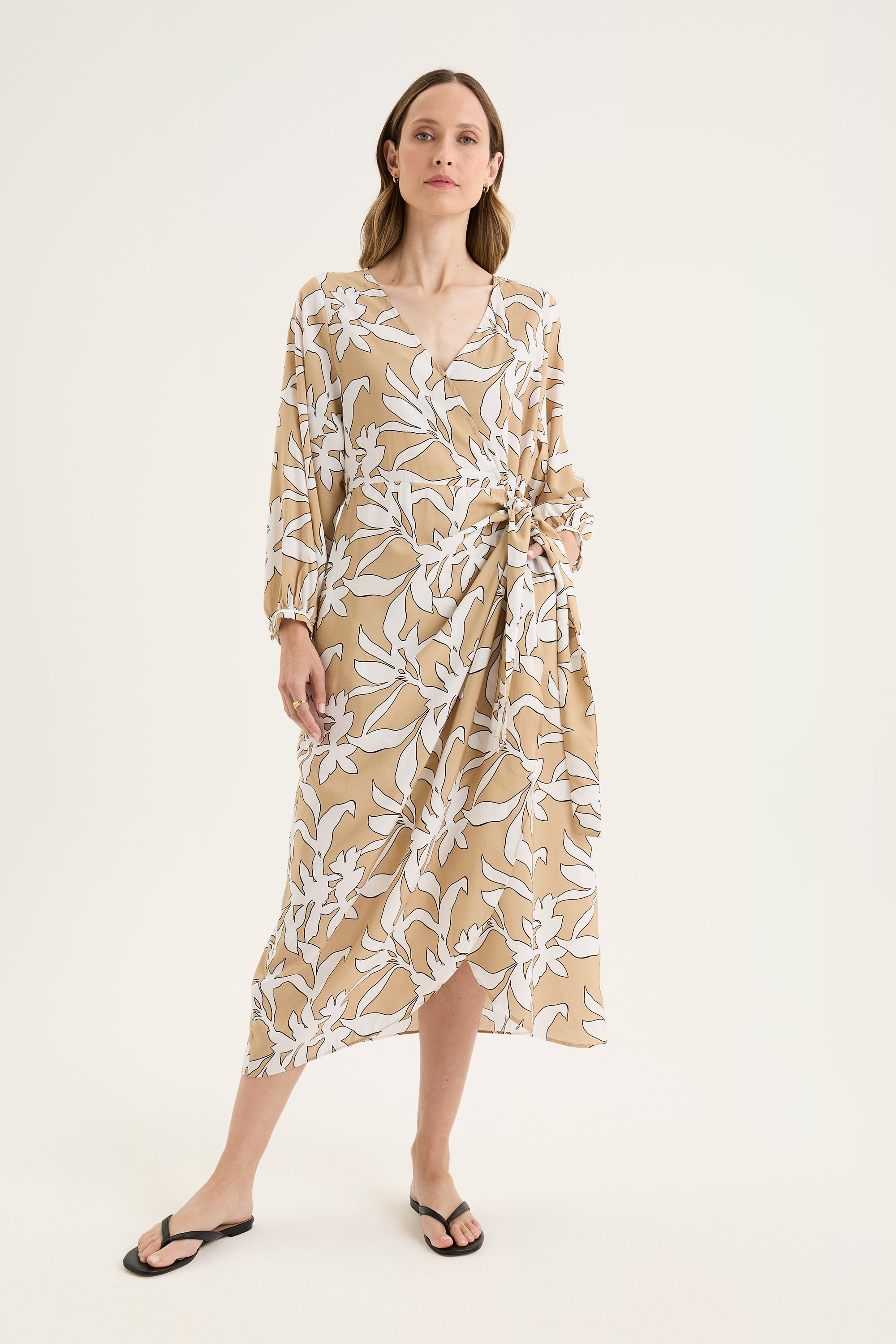 The Broadleaf Dress from Yarra Trail combines ease and refinement in one timeless piece. Crafted from a high-quality fabric in our exclusive leafy print, it features a mock wrap silhouette with a self-tie waist, creating a flattering shape without sacrificing comfort.