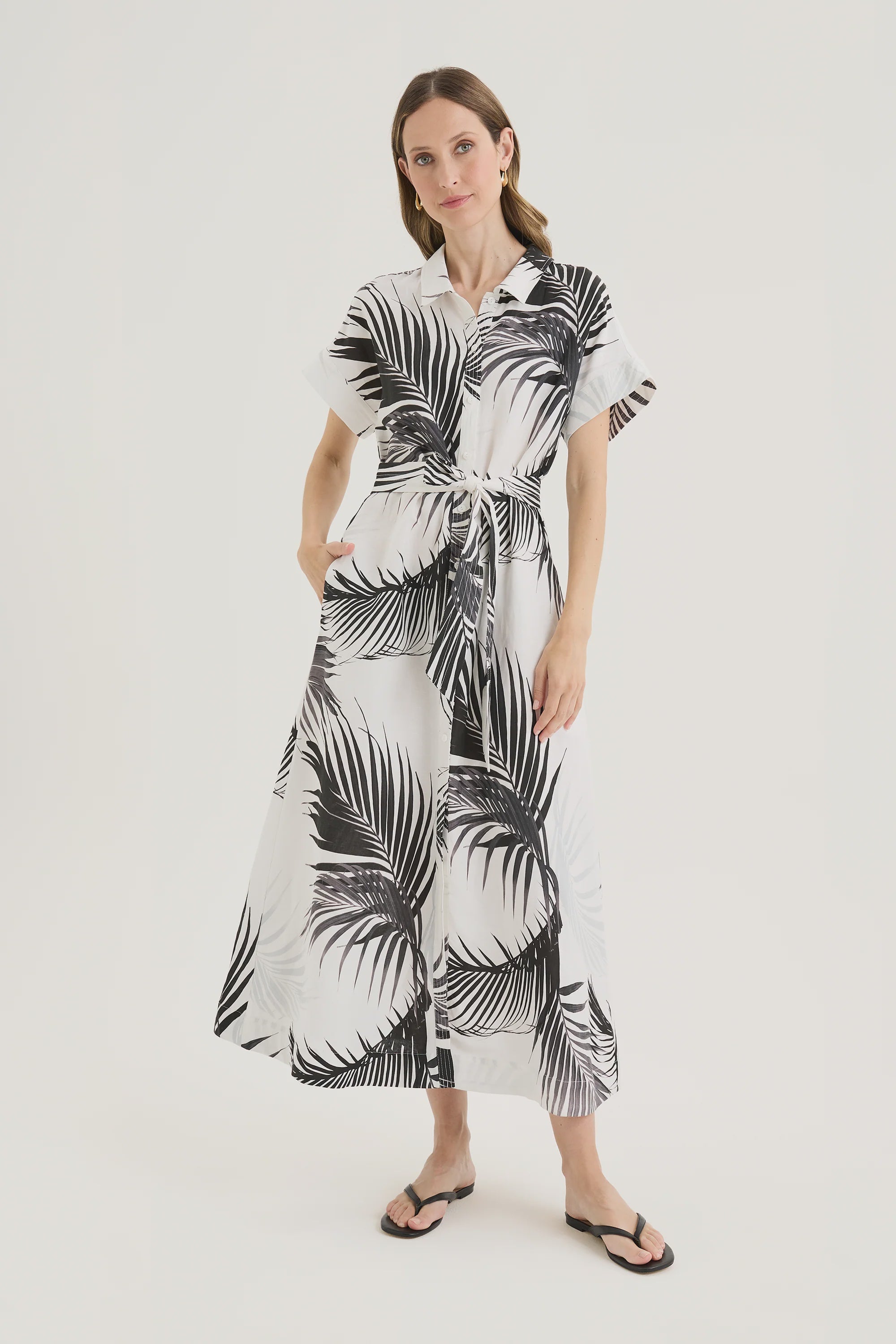 The Frond Dress is a contemporary shirt dress from Yarra Trail with a relaxed, resort-inspired edge. Crafted from a breathable linen-viscose blend, it’s printed in an exclusive leafy frond motif that brings subtle vibrancy to summer outfitting. The adjustable two-way collar can be worn folded down for a softer look or turned up for definition, while the button-through placket with topstitch detail adds polish. Extended short sleeves with wide cuffs balance the silhouette, complemented by a back yoke with gentle gathers for ease of movement. A matching self-tie belt allows you to define the waist or wear the dress loose.