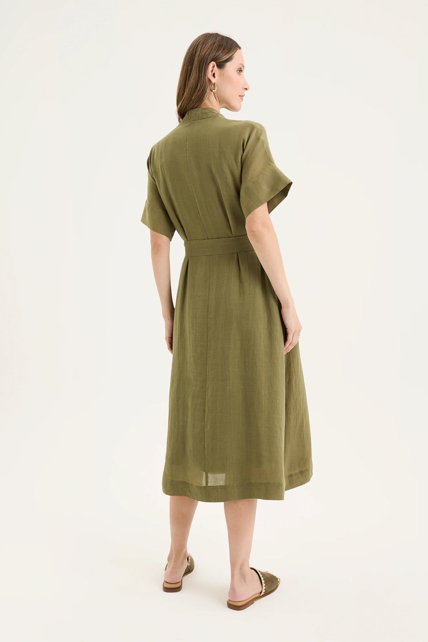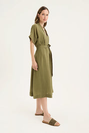 The Mateus Dress from Yarra Trail offers a considered balance of structure and ease, making it a true investment piece for this year's summer season and beyond. Crafted with a flattering V neckline, it’s defined by artfully placed front tucks that shape the silhouette while maintaining a fluid drape. The extended short sleeves and concealed button closure at the front add clean, understated detail, while the matching green waist tie allows the fit to be worn cinched or relaxed. Lined through the body for comfort and opacity, it also features functional inseam pockets for practicality. Falling to a mid-calf midi length in a semi-fitted, softly flared cut, it’s a versatile dress that feels equally at home styled for work, occasions, or everyday outfitting.