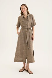 The Spina Dress from Yarra Trail strikes a considered balance between utility and summer ease. Crafted from a softly textured linen-cotton herringbone twill, it features a shirt collar, short sleeves with turned-up cuffs, and a full button-through front for effortless wear. The self-fabric waist tie threads through discreet belt loops, offering the option to define the silhouette or wear it loose for relaxed comfort. Finished with practical chest and side seam pockets and high hem splits for ease of movement, this above-ankle shirt dress is a versatile warm-weather staple