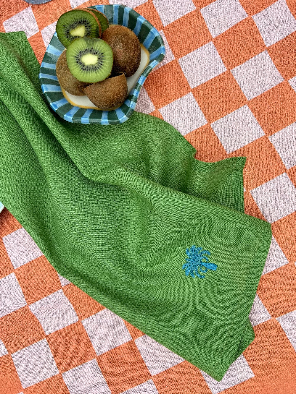 Hand dyed green linen blend napkins from Loco Living, embroidered with a contrast palm illustration. This classic napkin set contains two cloth napkins that can be paired with complimentary table linen. A refreshing garnish to the table. Practical and stylish, our cloth napkins are statement pieces that blend well with staple dinnerware.